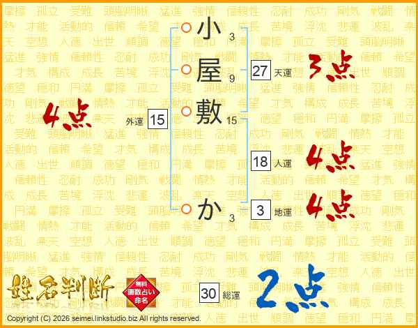 生活面を象徴する運勢です。外部から受ける影響力を表し、結婚運、家庭運や職場、環境への順応性を表します。総運から人運を引いた画数。姓や名が1文字の場合を除く。