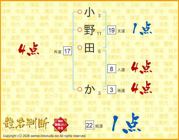 生活面を象徴する運勢です。外部から受ける影響力を表し、結婚運、家庭運や職場、環境への順応性を表します。総運から人運を引いた画数。姓や名が1文字の場合を除く。