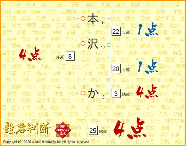 本沢かさんの天運は22画の1点!