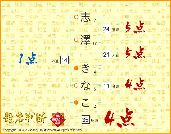 志(7画)澤(17画) き(4画)な(5画)こ(2画)