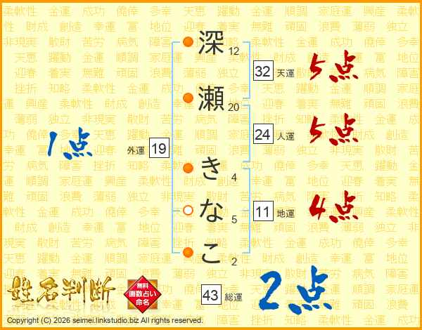 深(12画)瀬(20画) き(4画)な(5画)こ(2画)