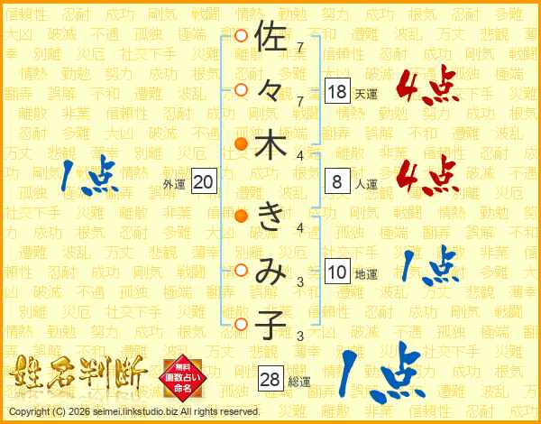 佐(7画)々(7画)木(4画) き(4画)み(3画)子(3画)