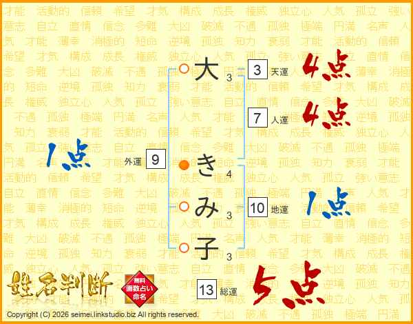 あなたの人生を表す1番重要な運勢です。生涯を通じて影響する総合運となり、主に50歳以降の晩年期に影響を及ぼします。苗字と名前の合計画数。