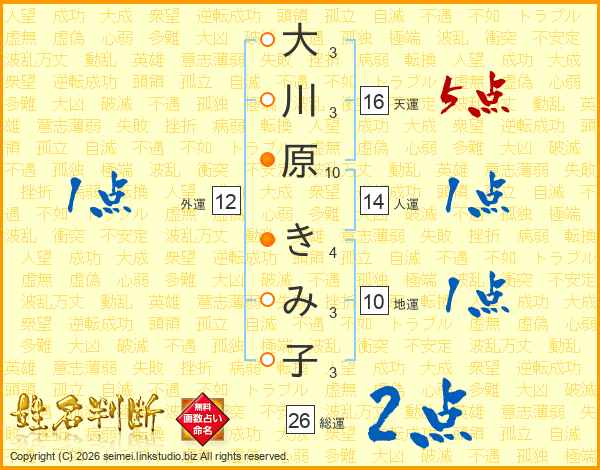大(3画)川(3画)原(10画) き(4画)み(3画)子(3画)
