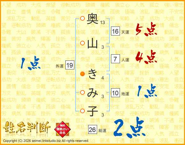 奥山きみ子さんの総運は26画の2点!