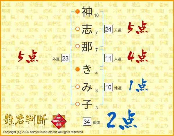 神(10画)志(7画)那(7画) き(4画)み(3画)子(3画)