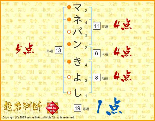 マ(2画)ネ(4画)パ(3画)ン(2画) き(4画)よ(3画)し(1画)