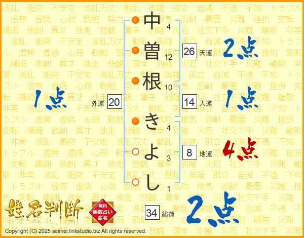 生活面を象徴する運勢です。外部から受ける影響力を表し、結婚運、家庭運や職場、環境への順応性を表します。総運から人運を引いた画数。姓や名が1文字の場合を除く。