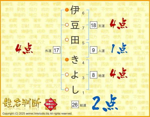 生活面を象徴する運勢です。外部から受ける影響力を表し、結婚運、家庭運や職場、環境への順応性を表します。総運から人運を引いた画数。姓や名が1文字の場合を除く。