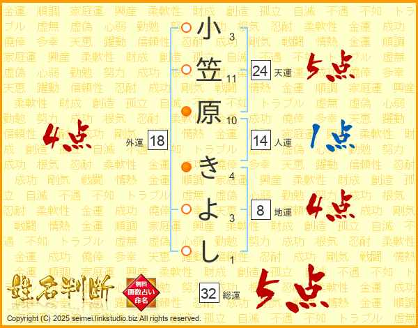 小(3画)笠(11画)原(10画) き(4画)よ(3画)し(1画)