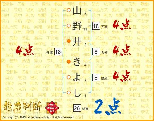 生活面を象徴する運勢です。外部から受ける影響力を表し、結婚運、家庭運や職場、環境への順応性を表します。総運から人運を引いた画数。姓や名が1文字の場合を除く。
