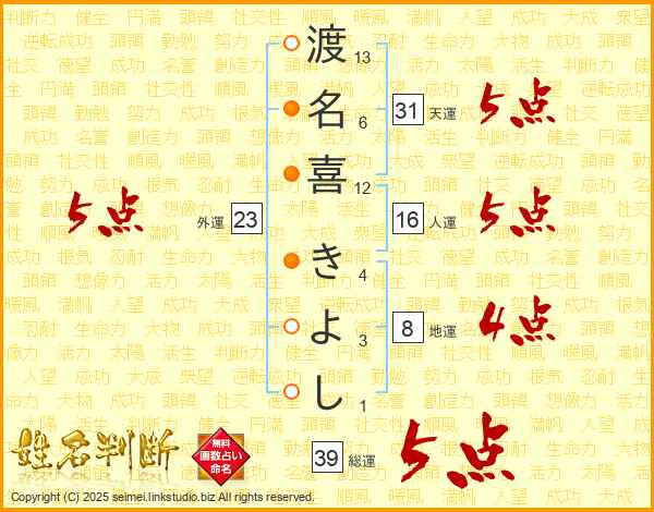 渡(13画)名(6画)喜(12画) き(4画)よ(3画)し(1画)