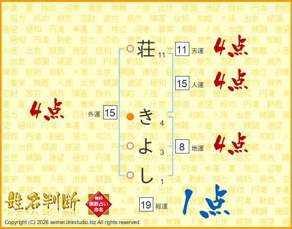 生活面を象徴する運勢です。外部から受ける影響力を表し、結婚運、家庭運や職場、環境への順応性を表します。総運から人運を引いた画数。姓や名が1文字の場合を除く。