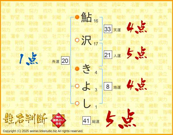 鮎沢きよしさんの総運は41画の5点!