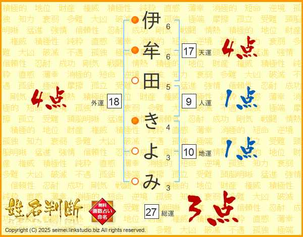 伊(6画)牟(6画)田(5画) き(4画)よ(3画)み(3画)