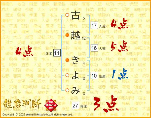 古(5画)越(12画) き(4画)よ(3画)み(3画)