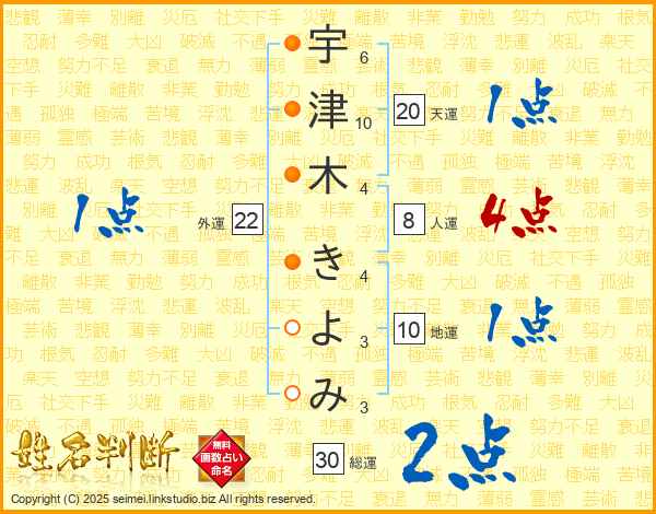 宇津木きよみさんの総運は30画の2点!