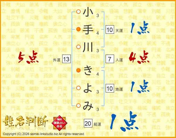 小手川きよみさんの総運は20画の1点!