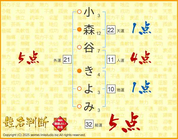 小(3画)森(12画)谷(7画) き(4画)よ(3画)み(3画)