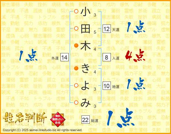生活面を象徴する運勢です。外部から受ける影響力を表し、結婚運、家庭運や職場、環境への順応性を表します。総運から人運を引いた画数。姓や名が1文字の場合を除く。