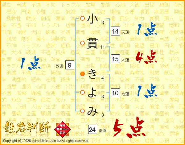小(3画)貫(11画) き(4画)よ(3画)み(3画)