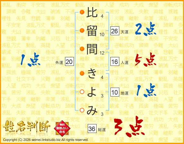 比留間きよみさんの天運は26画の2点!