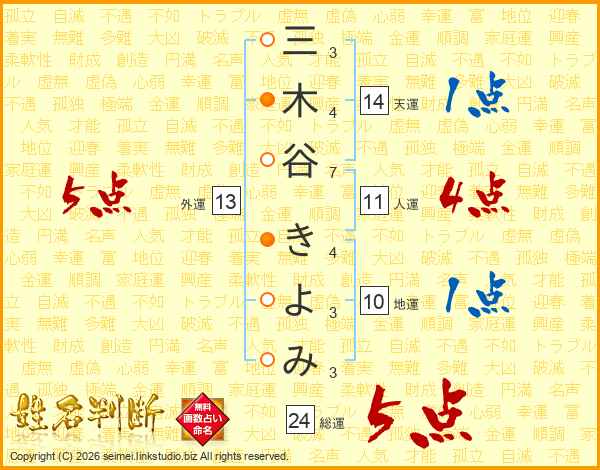 三(3画)木(4画)谷(7画) き(4画)よ(3画)み(3画)