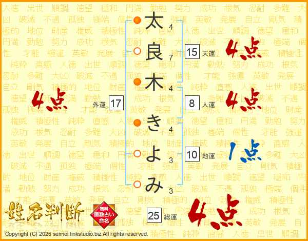 太良木きよみさんの総運は25画の4点!