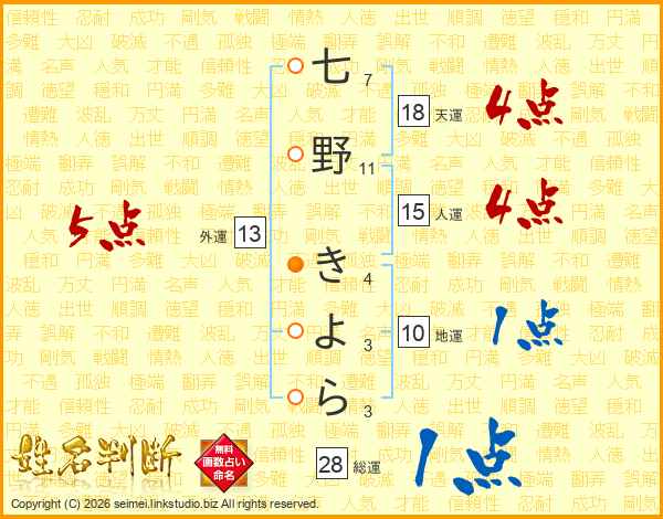 七野きよらさんの総運は28画の1点!