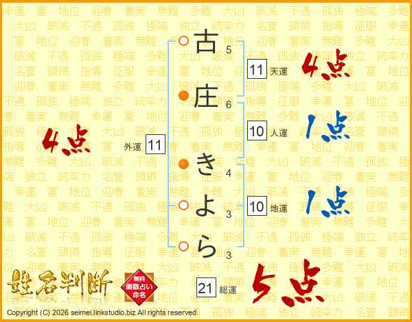古庄きよらさんの総運は21画の5点!