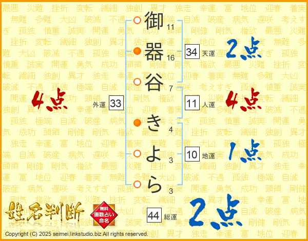 御器谷きよらさんの総運は44画の2点!