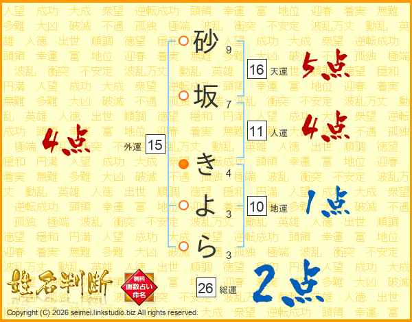 生活面を象徴する運勢です。外部から受ける影響力を表し、結婚運、家庭運や職場、環境への順応性を表します。総運から人運を引いた画数。姓や名が1文字の場合を除く。
