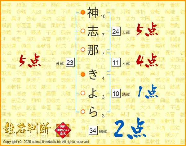 神(10画)志(7画)那(7画) き(4画)よ(3画)ら(3画)