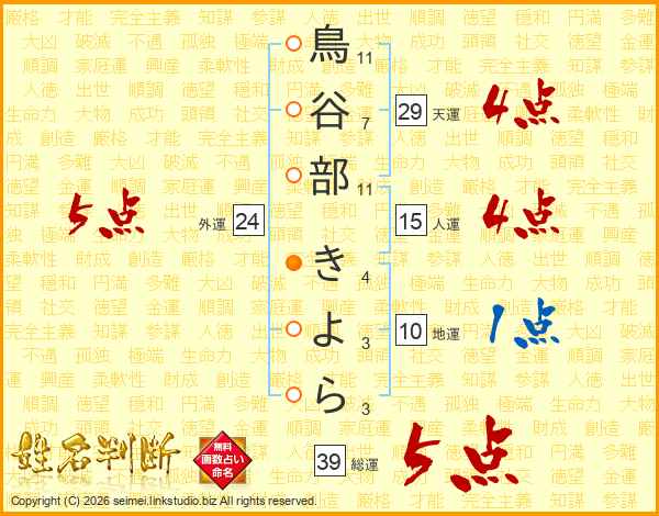 鳥谷部きよらさんの総運は39画の5点!