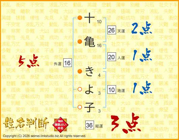 十亀きよ子さんの外運は16画の5点!