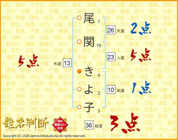 尾(7画)関(19画) き(4画)よ(3画)子(3画)
