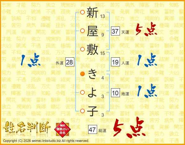 新屋敷きよ子さんの総運は47画の5点!
