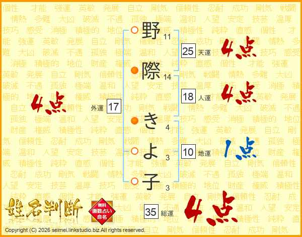 野際きよ子さんの総運は35画の4点!