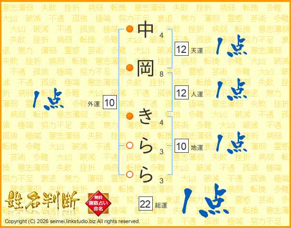 中岡きららさんの総運は22画の1点!