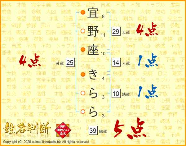 宜(8画)野(11画)座(10画) き(4画)ら(3画)ら(3画)