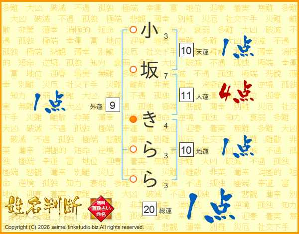 小(3画)坂(7画) き(4画)ら(3画)ら(3画)