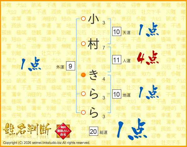 小(3画)村(7画) き(4画)ら(3画)ら(3画)
