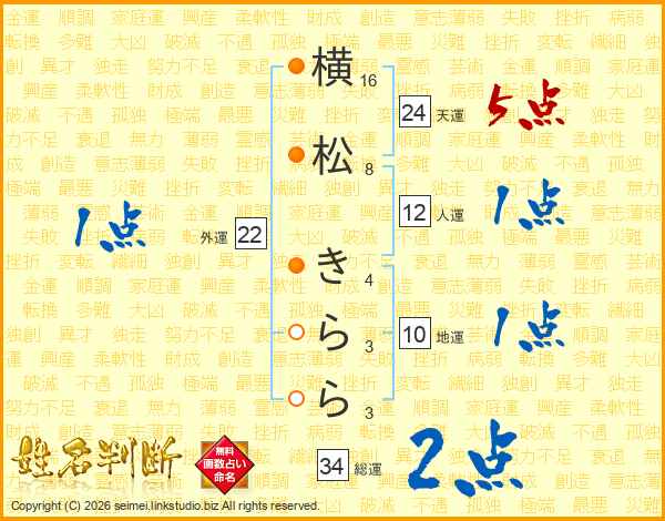 横(16画)松(8画) き(4画)ら(3画)ら(3画)