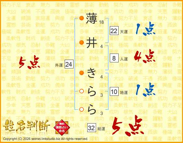 薄井きららさんの総運は32画の5点!