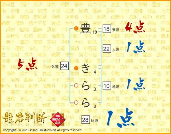 豊(18画) き(4画)ら(3画)ら(3画)