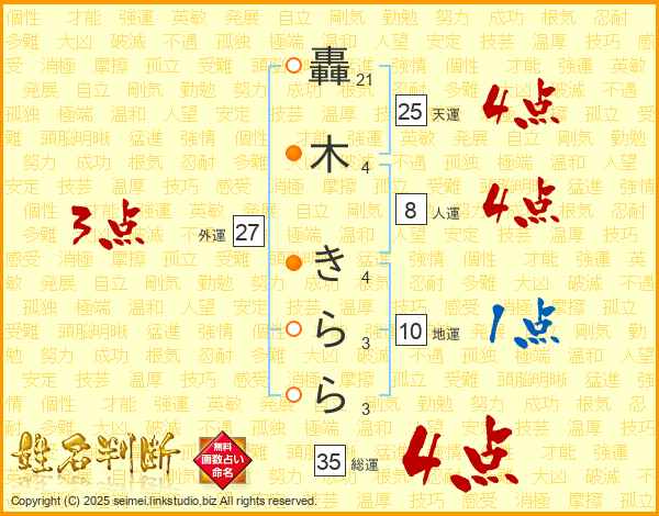 轟木きららさんの天運は25画の4点!