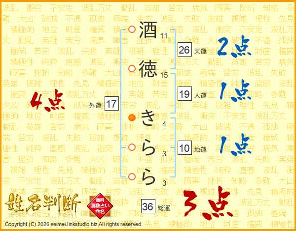 酒(11画)徳(15画) き(4画)ら(3画)ら(3画)