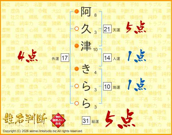 阿(8画)久(3画)津(10画) き(4画)ら(3画)ら(3画)