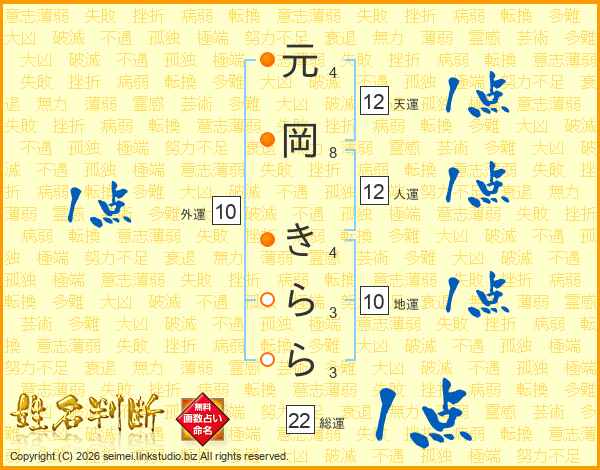 元(4画)岡(8画) き(4画)ら(3画)ら(3画)