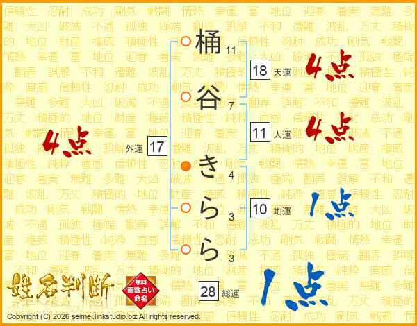 生活面を象徴する運勢です。外部から受ける影響力を表し、結婚運、家庭運や職場、環境への順応性を表します。総運から人運を引いた画数。姓や名が1文字の場合を除く。